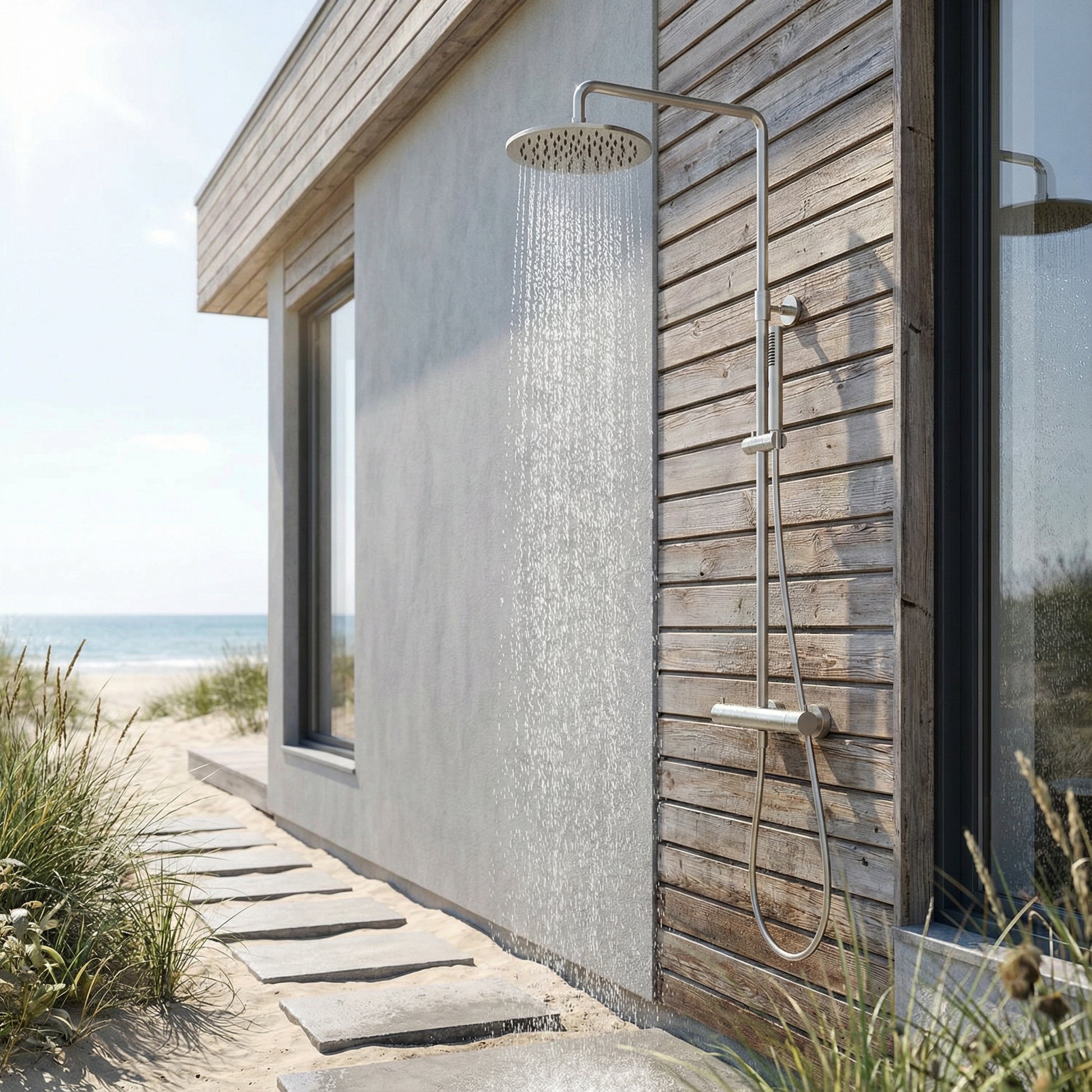 Exposed wall mount outdoor shower with thermostatic mixer, two-way diverter, hand shower, and rain shower head in brushed 316 marine grade stainless steel. Experience long-lasting reliability and durability with this unit, providing years of consistent and weather-resistant performance.