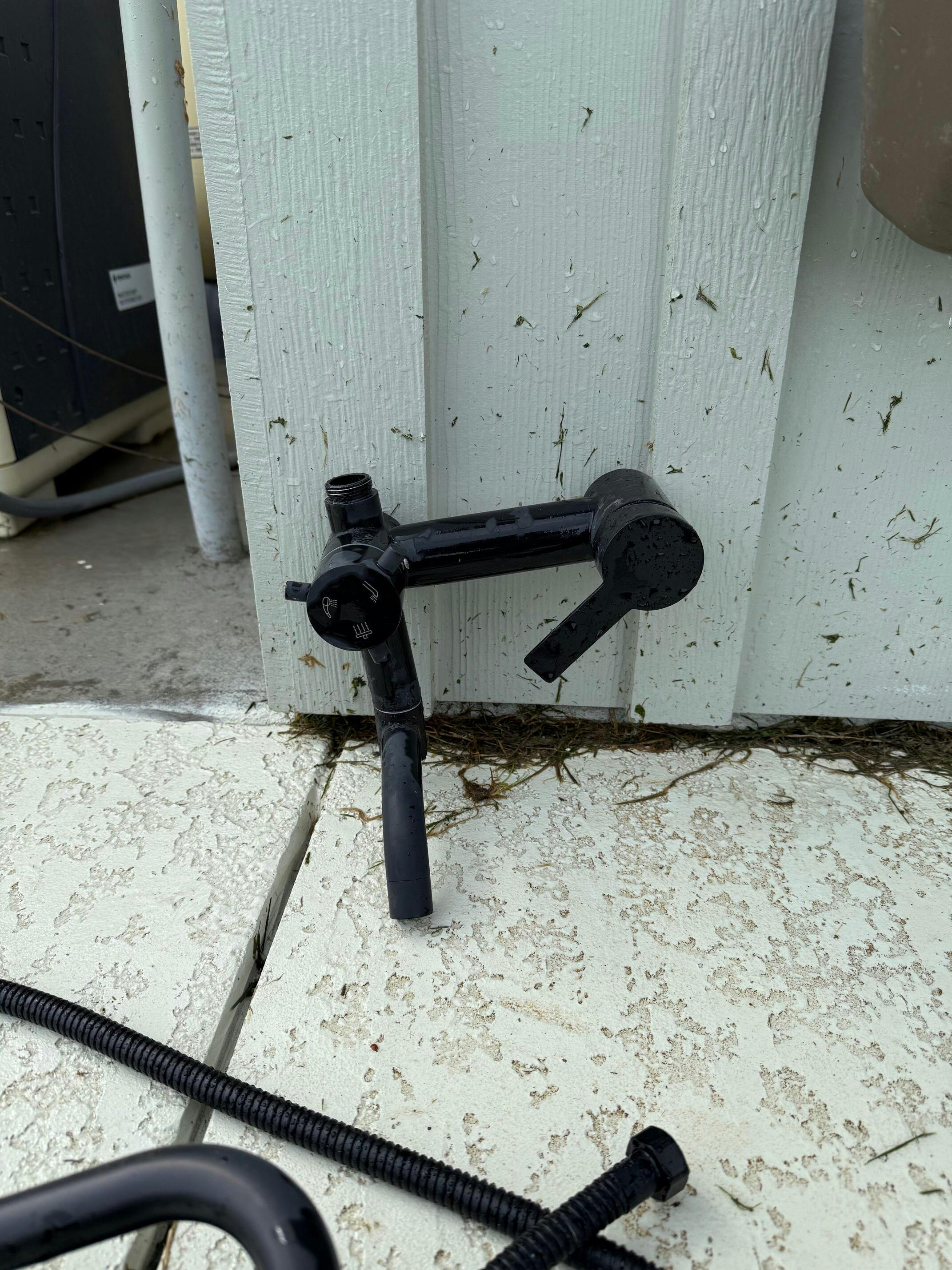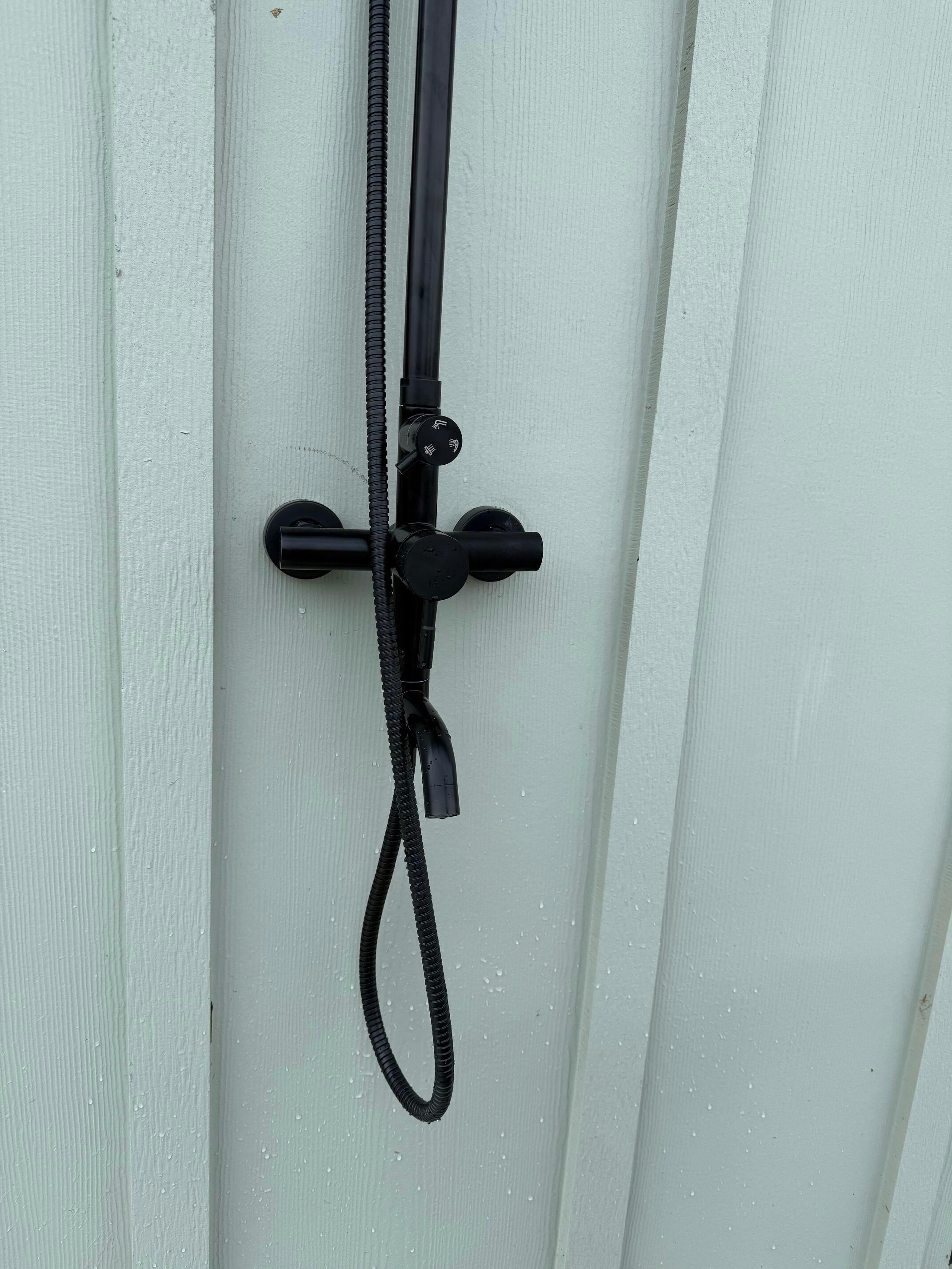 Exposed wall mount outdoor shower with single handle mixer, three-way diverter, round hand shower, foot wash spout, and rain shower head in matte black stainless steel. Constructed for extended durability and performance, this shower is sure to withstand the test of time, irrespective of weather conditions.