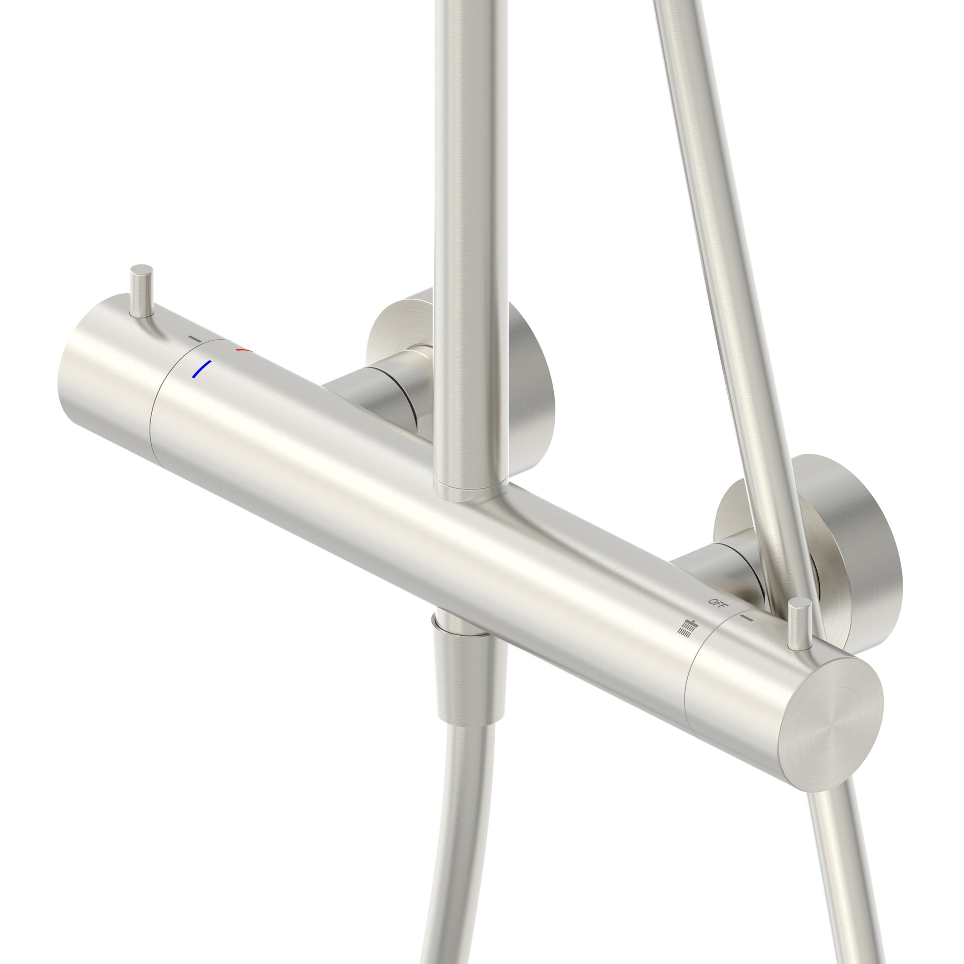 Exposed wall mount outdoor shower with thermostatic mixer, two-way diverter, hand shower, and rain shower head in brushed 316 marine grade stainless steel. Experience long-lasting reliability and durability with this unit, providing years of consistent and weather-resistant performance.